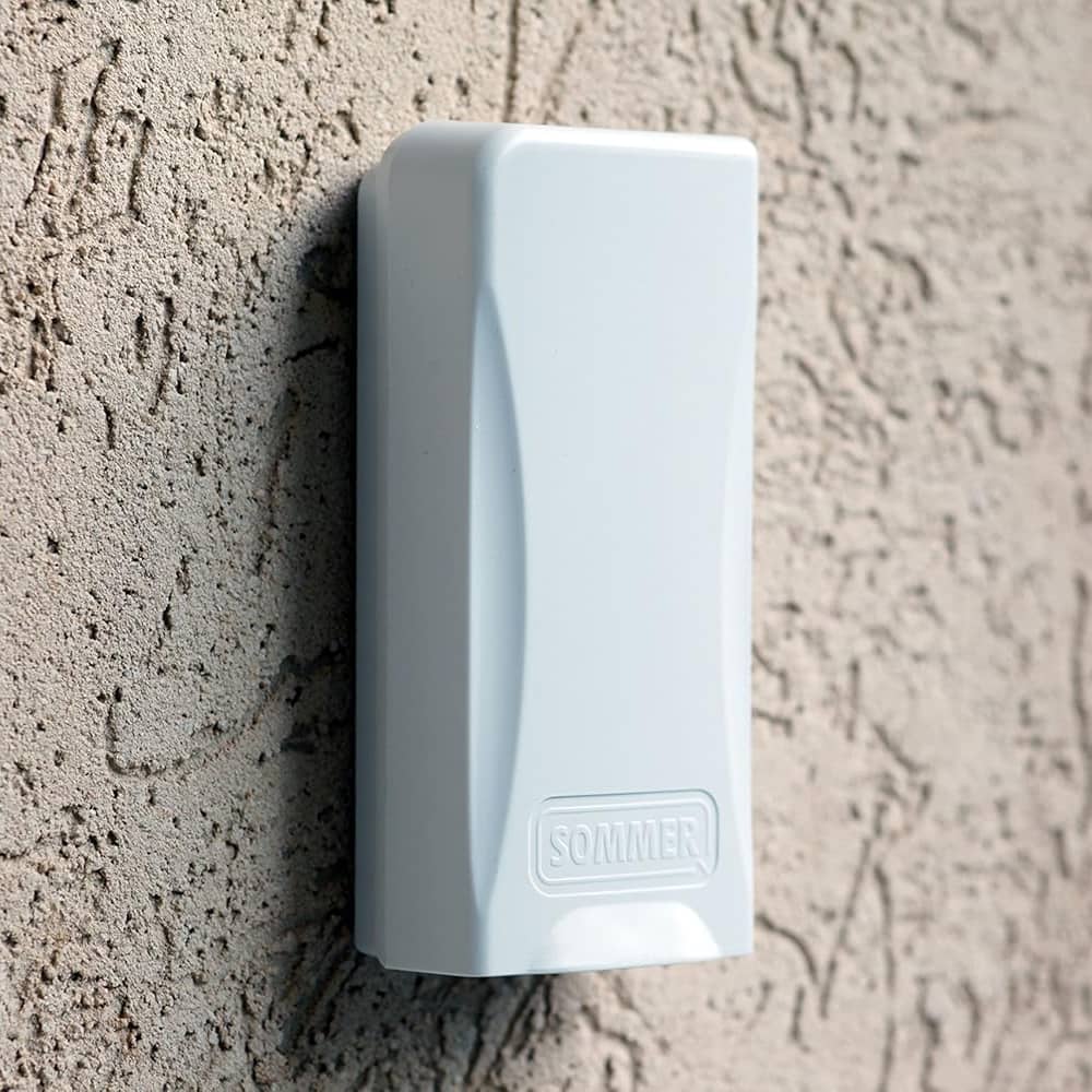 Beim ENTRApin von Sommer handelt es sich um einen 1-Befehl Funcode-Taster, der in einem grauen Gehäuse ist. Mit einem festgelegten Code können Garagentore, Haustüren oder Hoftore geöffnet werden. Das Gerät wird an der Wand neben der zu öffnenden Tür angebracht und gestattet Personen Zutritt, nachdem eine vorher programmierte Zahlenkombination als Code eingegeben wurde. Das bequeme Türöffnungssystem arbeitet auf der Funkfrequenz FM 868,8 MHz. Die individuelle Codierung muss mindestens 4 und darf maximal 8 Ziffern enthalten. Für das batteriebetriebene Zugangssystem ist kein Stromanschluss erforderlich.