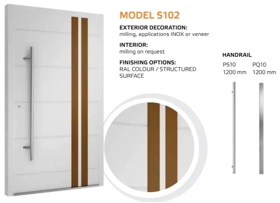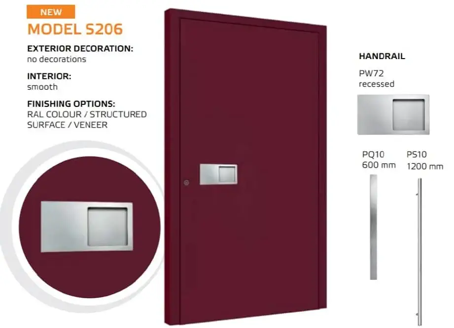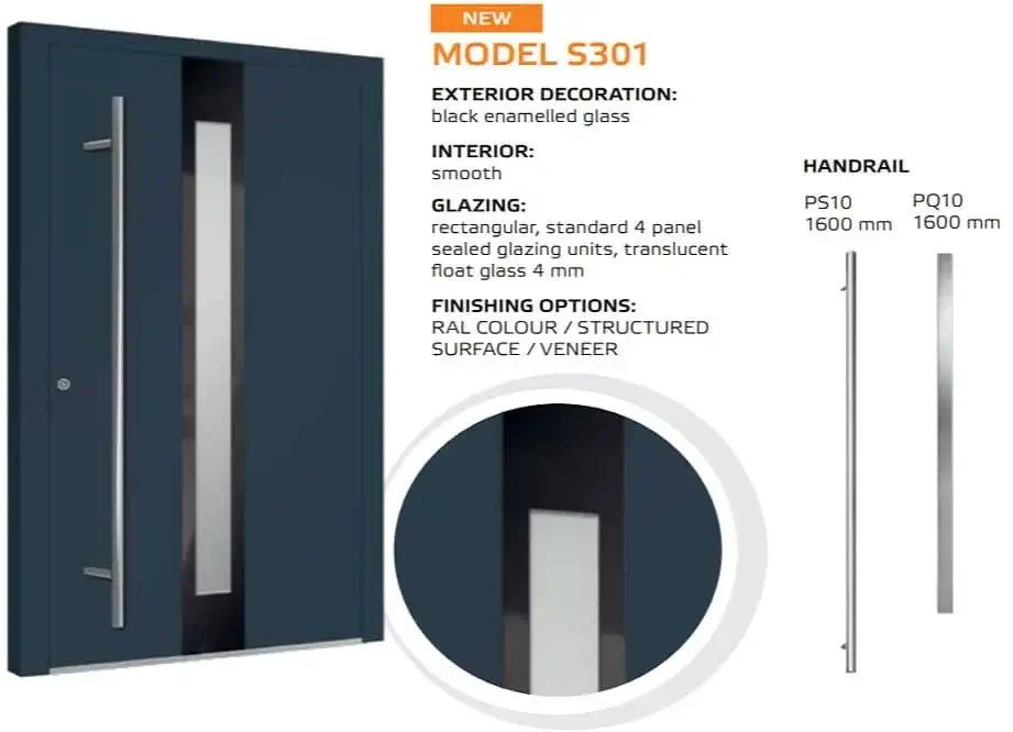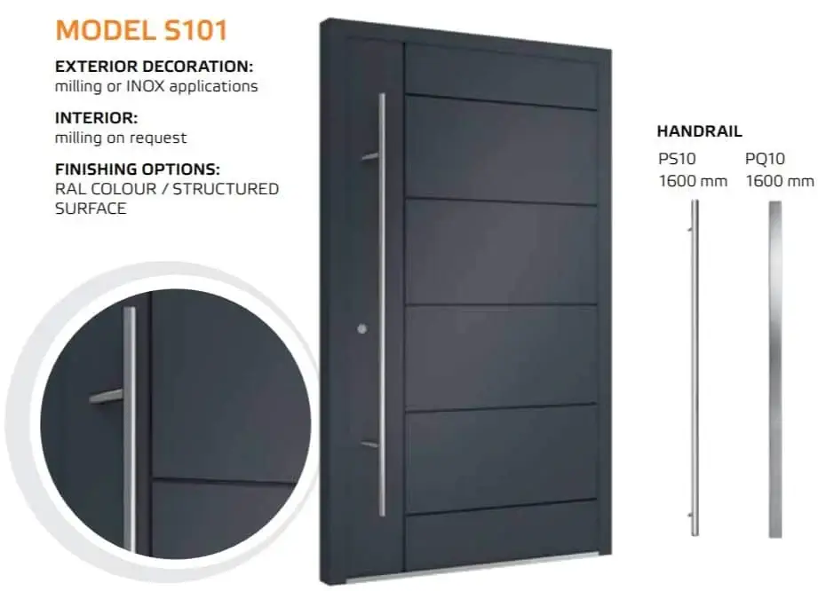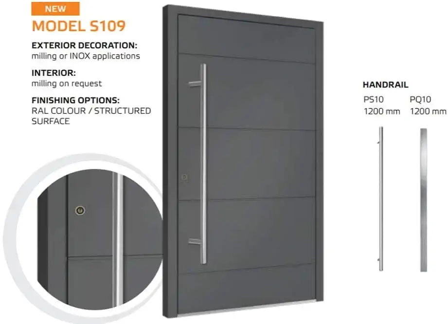 Die Tür ist einheitlich mit einem automatischem 3-Punkt-Schloss, einem Edelstahl Drücker auf einem Längsschild und drei Stück Rollenbänder an der Innenseite ausgestattet. Für die Außengriffe kann man zwischen einer Rundstange mit einer Länge von 1200, 1600 und 1800 mm und einer Eckstange mit 800, 1200 und 1600 mm wählen. Die gewünschte Länge vermerken Sie bitte im Kommentarfeld am Ende des Bestellvorgangs.
