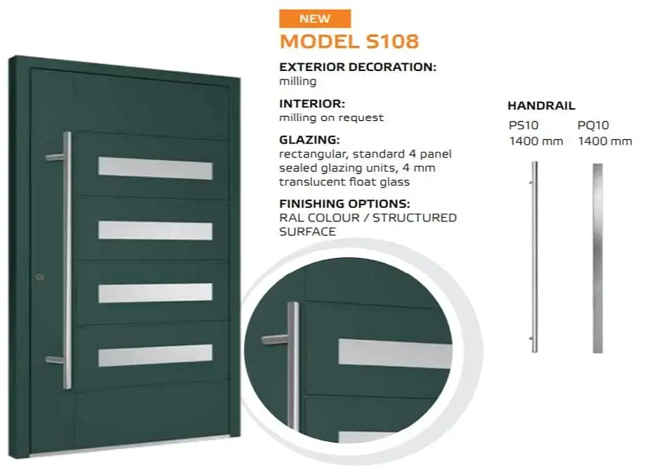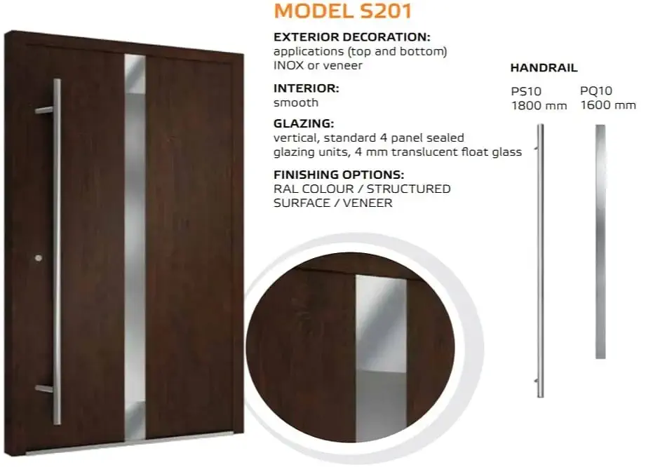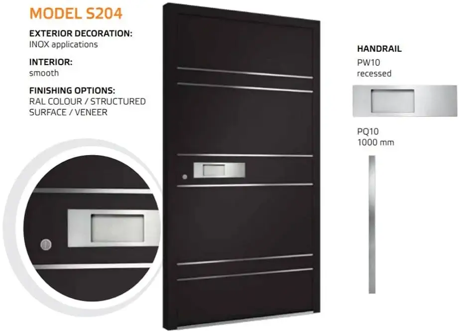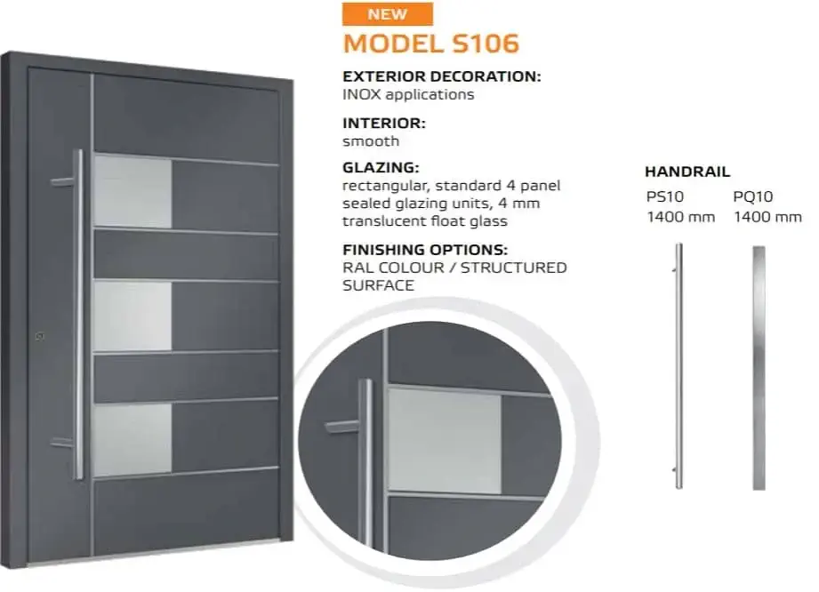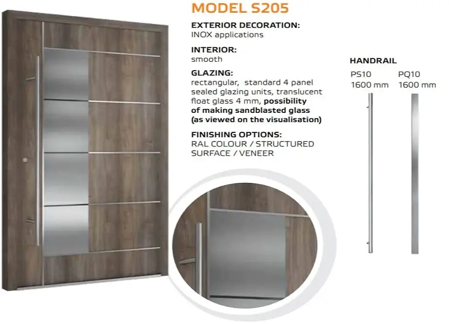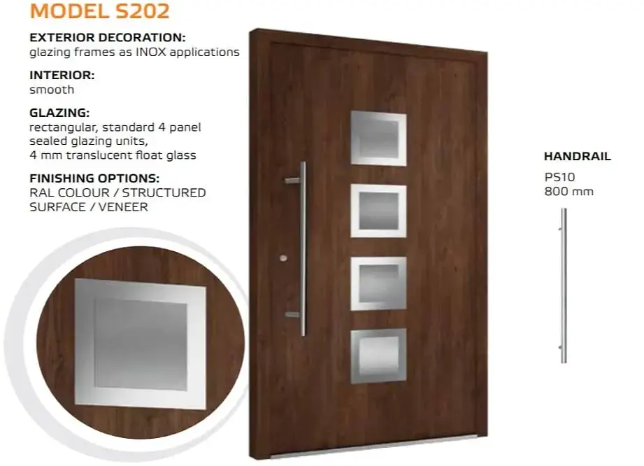 Die Tür ist einheitlich mit einem automatischem 3-Punkt-Schloss, einem Edelstahl Drücker auf einem Längsschild und drei Stück Rollenbänder an der Innenseite ausgestattet. Für die Außengriffe kann man zwischen einer Rundstange mit einer Länge von 1200, 1600 und 1800 mm und einer Eckstange mit 800, 1200 und 1600 mm wählen. Die gewünschte Länge vermerken Sie bitte im Kommentarfeld am Ende des Bestellvorgangs.